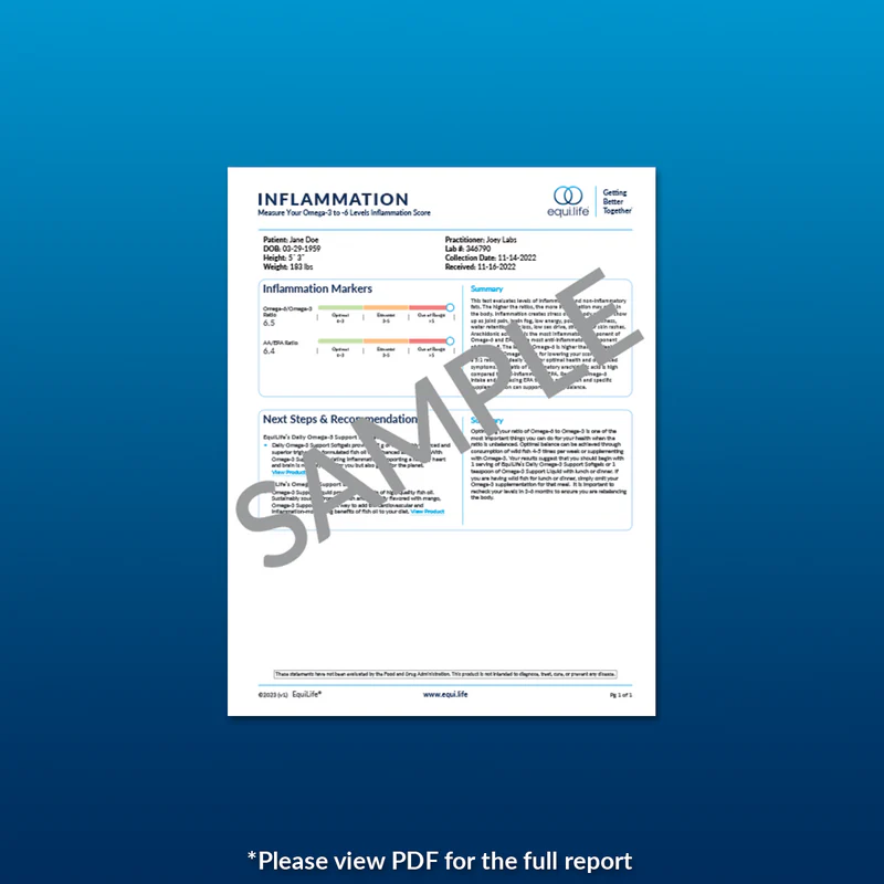Inflammation is natural. It helps us fight infections and digest food, and maintain a healthy equilibrium. Many things can alter the levels of fatty acids in your body, the indicators of inflammation. An unbalanced diet, compromised microbiome, and even stress can alter the ratio of omega-3 to omega-6 fatty acids. If unchecked, inflammation can be very harmful to heart health. But before you start trying new diets and lifestyle changes, first you need to know where you stand. The Omega-3 & Inflammation test checks important ratios of fatty acids in the blood to monitor and evaluate your unique levels of inflammation.
