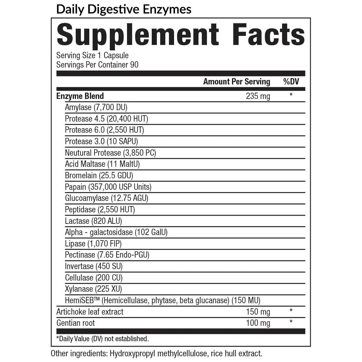 A healthy diet means enjoying a diverse range of fresh produce, protein, fats, and complex carbohydrates. Yet often, many people suffer from food intolerances and sensitivities that make digesting certain foods challenging. Daily Digestive Enzyme gives your body what it needs to optimize digestion and enhance the absorption of nutrients from your food. Everyone reacts differently to different foods, and Daily Digestive Enzyme is here to make digestion easier for everyone.
